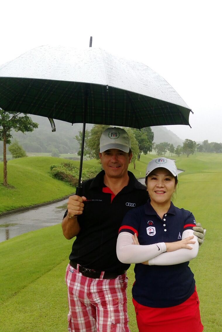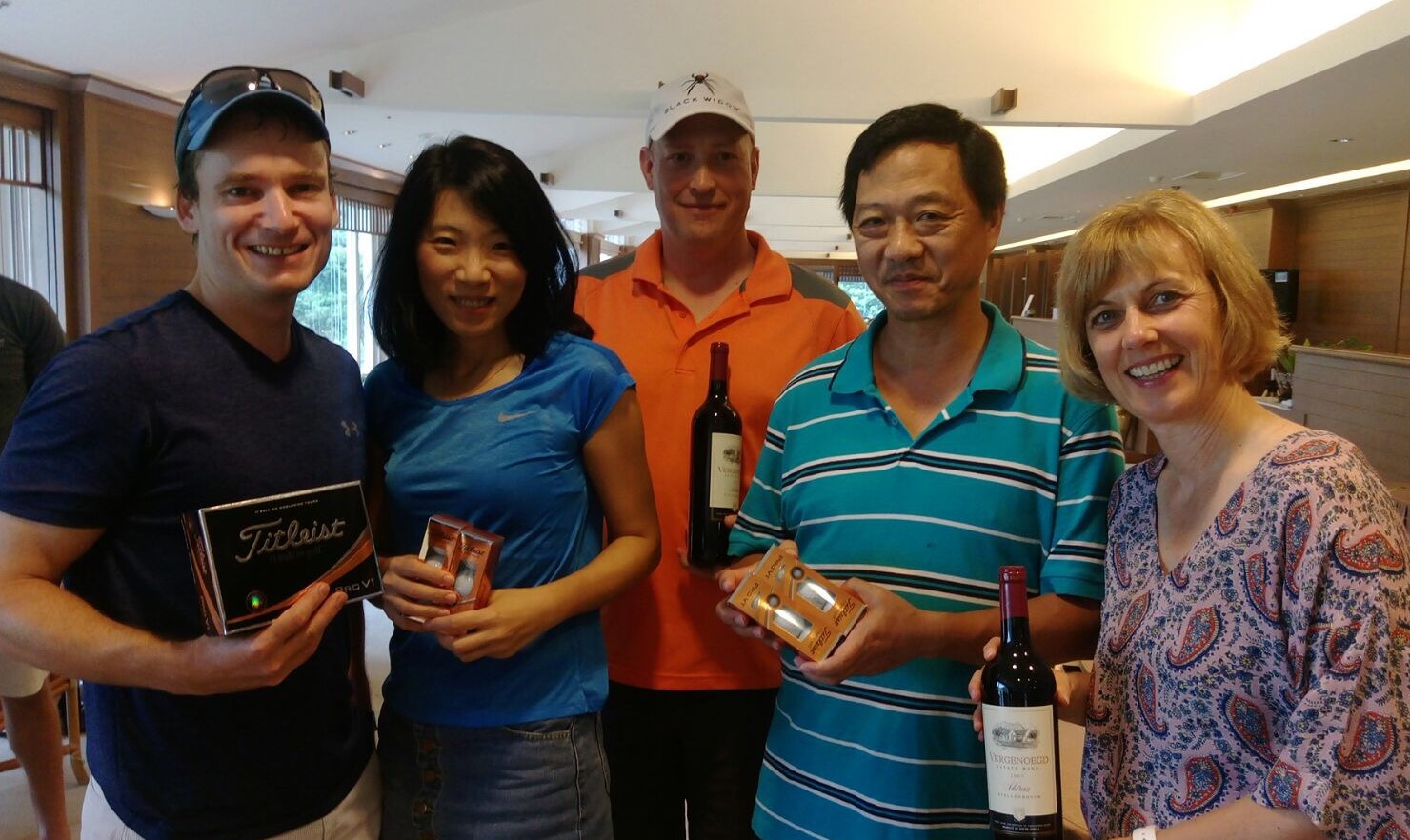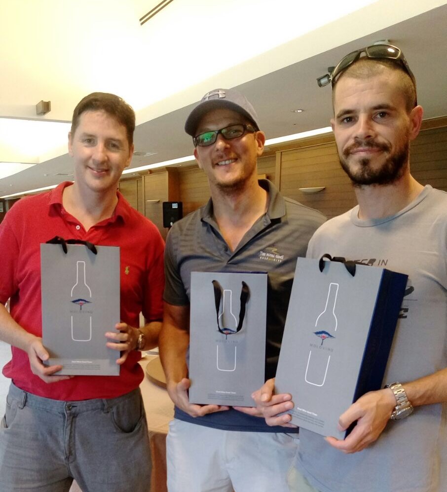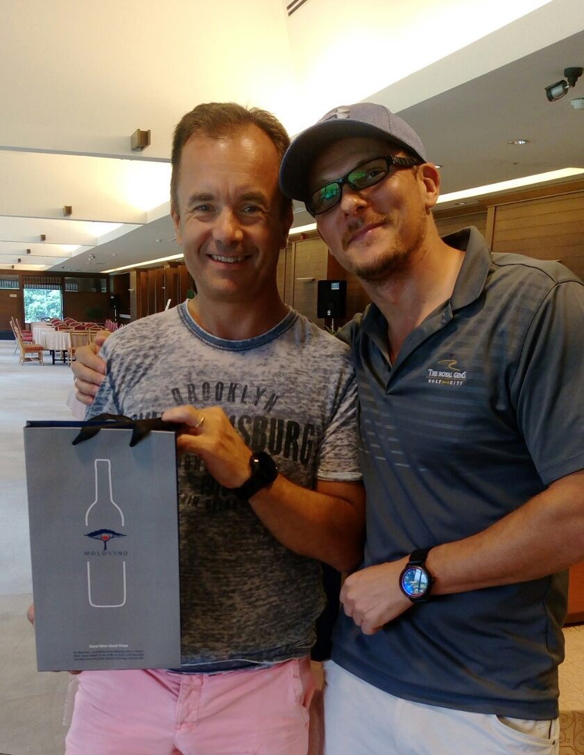 Near Pin Winners Kerry and Neels presented with wine by Peter on behalf of new sponsor Molovino